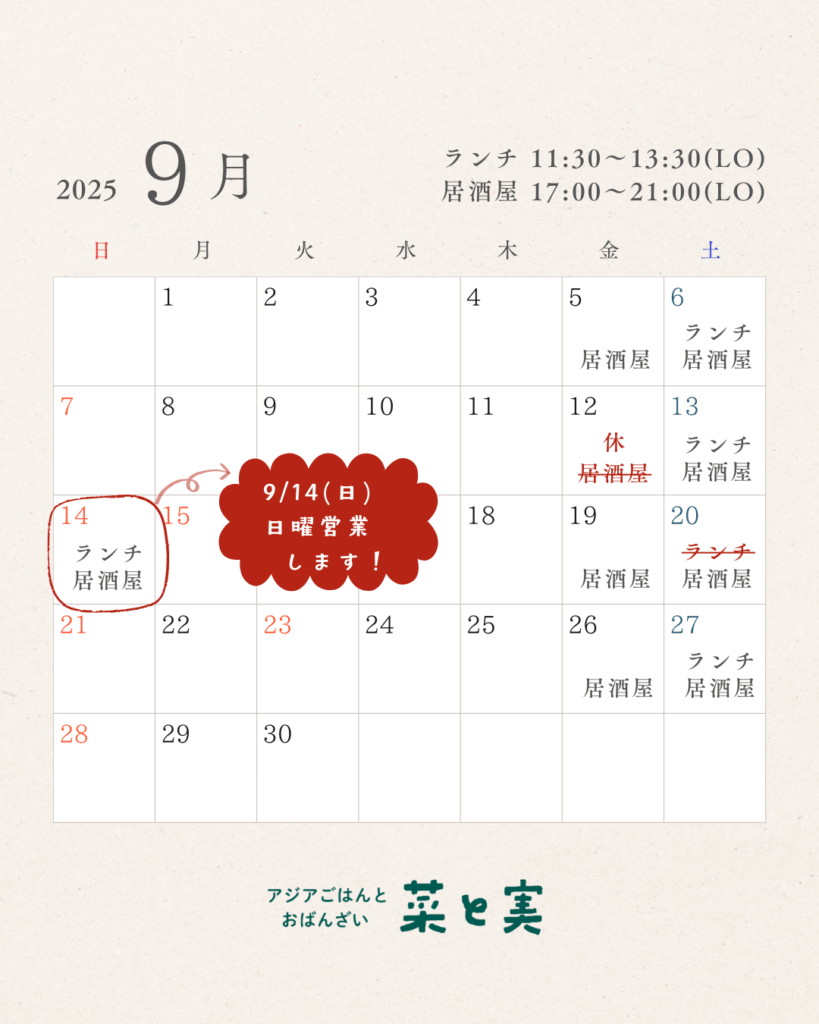 【9月】菜と実 営業日のご案内