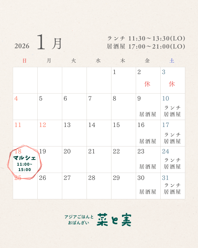 【1月】菜と実 営業日のご案内